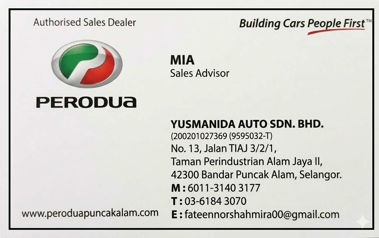 Hai! Nama saya Mia, Sales Advisor Perodua Sungai Buloh yang sah. Berpengalaman lebih 9 tahun dalam bidang jualan kereta di Malaysia.